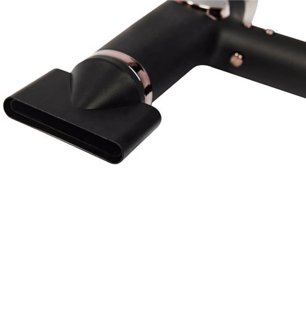 This hair blow dryer has a straight, cylindrical main body with a handle extending from the side, forming a T-like shape. A small digital display is positioned on the upper portion of the body. Button controls are located on the handle. The hair dryer comes with two interchangeable nozzle attachments.